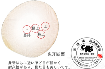 - 当店には先代から受け継ぐ「印材は一級品だけを使う」というこだわりがあります。例えば象牙の品質には幅があります。当店では通商産業省・環境省認定された「上ランク以上」の象牙のみ使用しています。黒水牛においては良質でもっとも強い「極上芯持ち」のみ、 柘植つげは多数産地がありますが「国内産薩摩本つげ」のみを使用します。これも先代からのこだわりです。すべての印材は仕入れ段階で1本1本厳選しておりますので、自信をもってお薦めいたします。